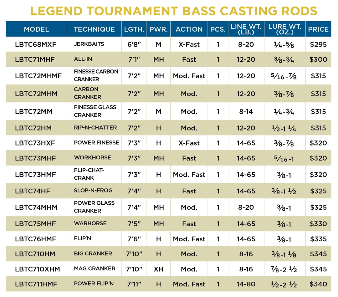 A legend, reimagined. The next generation of Legend Tournament Bass is the latest in St. Croix Rod design, materials, and angler recognized feedback. Featuring specific handles, lengths, powers, and actions for todayās latest techniques, the next generation also delivers two new materials to your arsenal. All models will feature SCIV+ Carbon Fiber, a strategic lay-up of exclusive SCIV and SCVI, and select models SCIV + with iAct Glass, a carbon fiber hybrid with internally active Linear S-Glass.Ā 16 new casting models feature:Ā