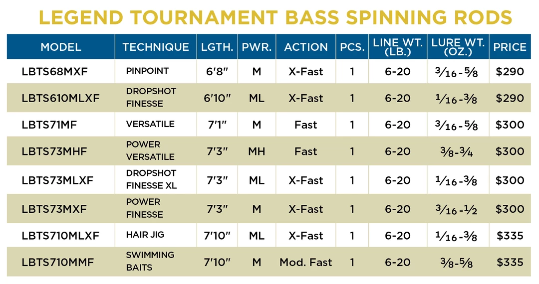 A legend, reimagined.Ā The next generation of Legend Tournament Bass is the latest in St. Croix Rod design, materials, and angler recognized feedback.Ā Featuring specific handles, lengths, powers, and actions for todayās latest techniques, the next generation also delivers two new materials to your arsenal. All models will featureĀ SCIV+ Carbon Fiber, a strategic lay-up of exclusive SCIV and SCVI, and select modelsĀ SCIV + with iAct Glass, a carbon fiber hybrid with internally active Linear S-Glass. 8 new spinning models feature:Ā