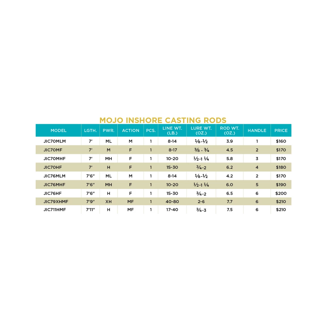 New for 2021, the re-engineered Mojo Inshore gets upgrades with our proprietary SCIII carbon and built using IPC mandrel technology. Tailored for the demands of inshore fishing, the next generation of Mojo Inshore is built to deliver.