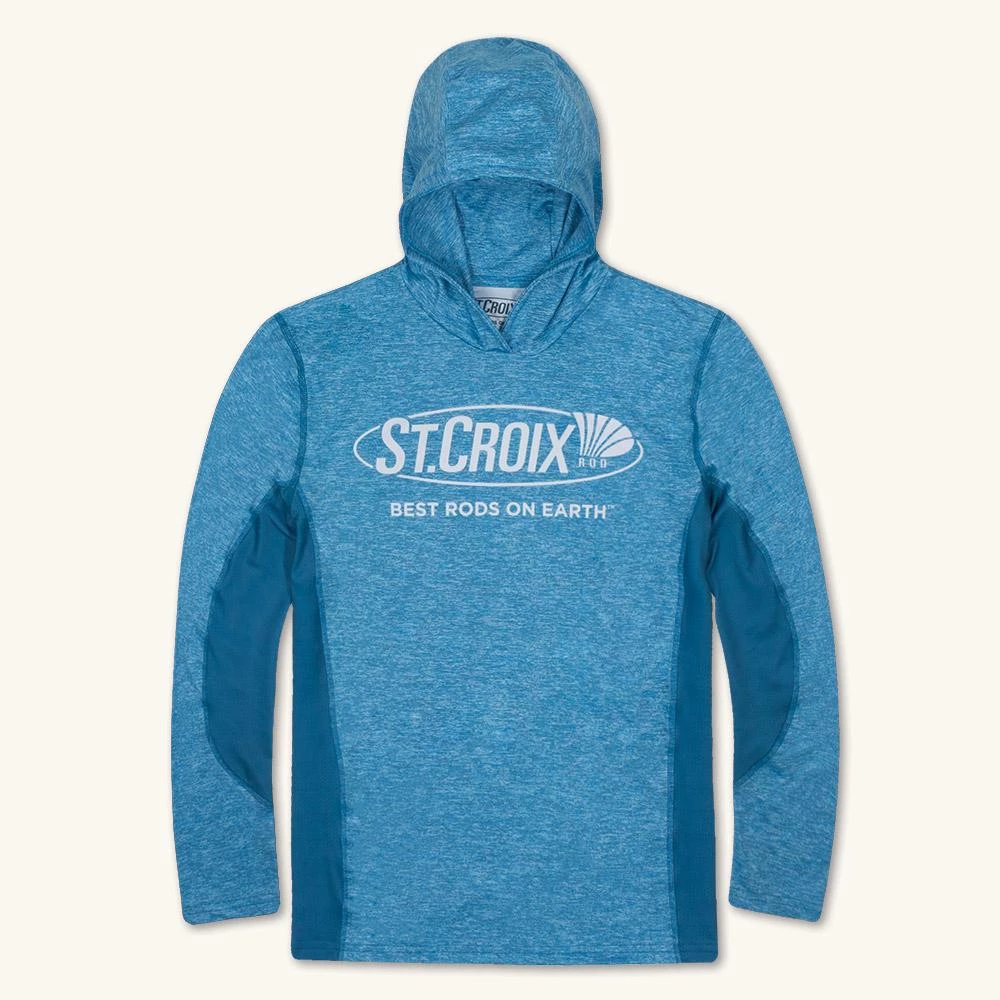 This performance hoodie was crafted with the St. Croix Rods angler in mind. This hoodie is 90% polyester 10% Spandex and comes in a light blue heathered look and unisex fit. Technical features include Sun Protection Fabric that is UPF 50+ , Side Mesh Panels for added breath-ability and comfort, Stain Resistance fabric built with the angler in mind, Moisture Wicking and Quick Dry Material, and is made of an Anti-microbial performance fabric. Fish for peak performance with the New St. Croix Rods Performance Hoodies!